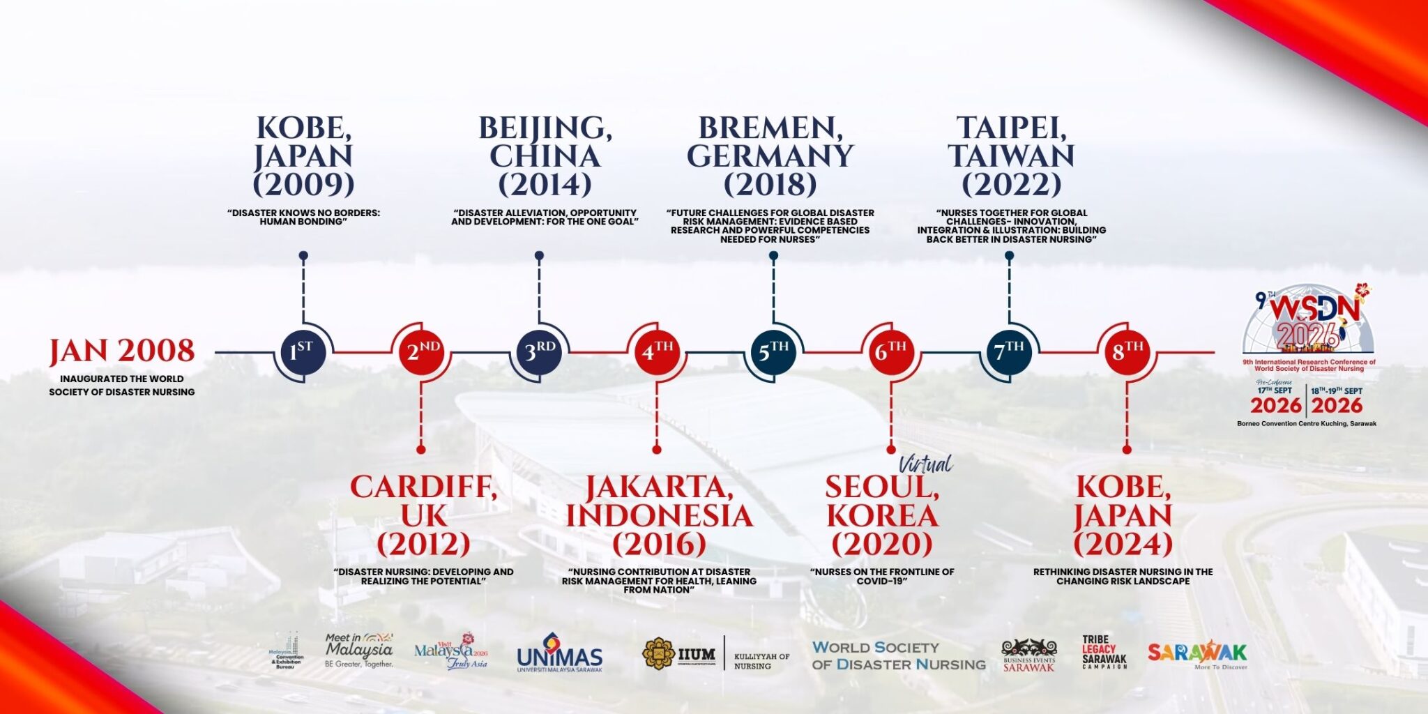 The World Society of Disaster Nursing (WSDN) was established in 2008 with the mission to advance disaster nursing globally through academic collaboration, research, and knowledge exchange. Since its first international conference held in Kobe, Japan, in 2009, WSDN has grown into a leading platform for experts, practitioners, and researchers committed to strengthening disaster preparedness, response, and resilience in healthcare.